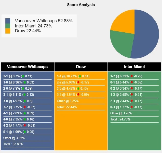 Với các tỷ số có khả năng xảy ra, đội chủ nhà Vancouver Whitecaps thắng lợi 2-0 đạt 7,9%. Đội chủ nhà và đội khách hoà 1-1 đạt 10,27%.Đội khách Inter Miami có 5,44% đánh bại Vancouver Whitecaps 1-0.