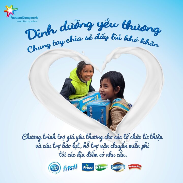 Là một trong những tập đoàn dinh dưỡng hàng đầu thế giới theo đuổi sứ mệnh mang đến nguồn dinh dưỡng tốt hơn cho mọi người và hòa cùng tinh thần đoàn kết, “tương thân tương ái”, “lá lành đùm lá rách”, tình yêu thương đồng bào ruột thịt, FrieslandCampina Việt Nam chung tay với các tổ chức chính trị - xã hội như Trung ương Hội Chữ thập đỏ, Hội Liên hiệp Phụ nữ, các nhà phân phối địa phương… mang những phần quà thiết thực cùng những niềm vui nhỏ bé, ấm áp tới người dân vùng lũ.