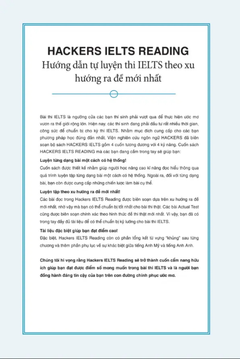 Hiện nay, band điểm IELTS cao là mong muốn, mục tiêu phấn đấu của nhiều sĩ tử đang luyện thi IELTS. Bài thi như 1 chiếc chìa khóa giúp các bạn mở ra cánh cửa thực hiện ước mơ, vươn mình ra thế giới. Để thực hiện được ước mơ của mình nhiều bạn đã dành rất nhiều thời gian, công sức để ôn tập chuẩn bị cho kì thi. Thấu hiểu được những khó khăn trong quá trình học của các bạn nhóm chuyên gia đã nghiên cứu, biên soạn và cho ra đời quyển sách Hackers IELTS Reading nhằm mục đích cung cấp cho bạn phương pháp học đúng đắn phù hợp nhất.