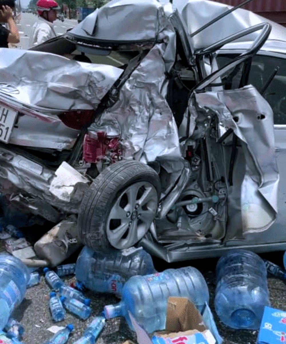 Tại hiện trường, 3 phương tiện dính chùm nhau trên Quốc lộ 13. Đầu xe tải chở nước bẹp dúm dính chặt vào xe container, tài xế mắc kẹt bên trong. Ngay bên cạnh là xe 4 chỗ (xe tập lái) bị bẹp dúm phần đuôi.