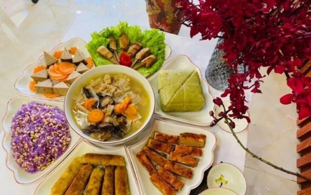 - Mâm cúng chay: Gồm các món rau củ xào chay, canh rau củ nấu chay, bắp non, nấm rơm, nấm đông cô, đậu hà lan, đậu phụ, cà rốt, củ cải trắng; đậu phụ chiên xào nấm tươi; miến xào chay với cà rốt, nấm rơm, đậu hũ, gia vị nêm vừa phải; giò, chả chay và xôi gấc.