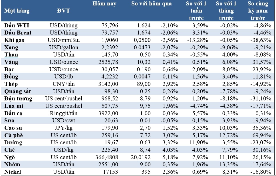 Giá dầu Brent giảm 1,88 USD, tương đương 2,3%, đóng cửa ở mức 79,55 USD/thùng, trong khi giá dầu thô West Texas Intermediate (WTI) của Mỹ giảm 1,89 USD, tương đương 2,4%, đóng cửa ở mức 75,53 USD.