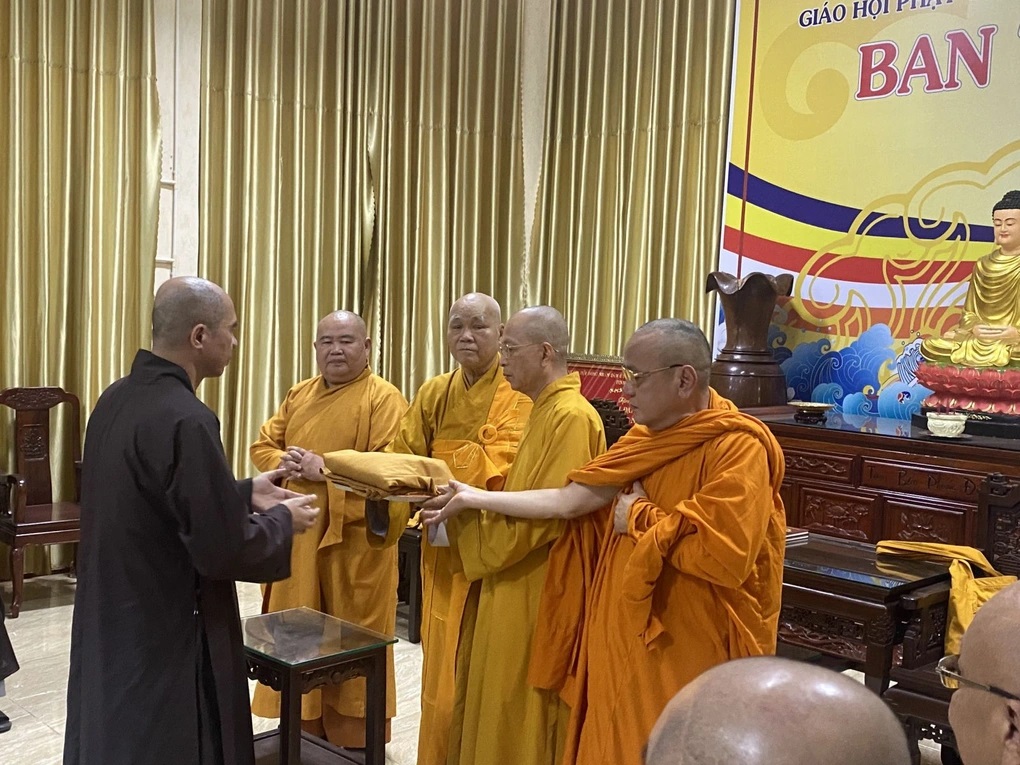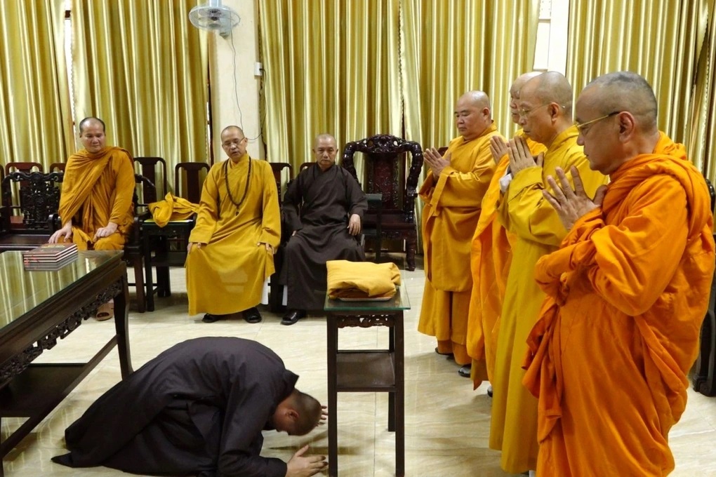 Phật tử Lê Trung Hai (pháp danh Nhuận Nghi) trả lại pháp y trước khi hoàn tục (Ảnh: Giáo hội Phật giáo Việt Nam tỉnh Đồng Nai).