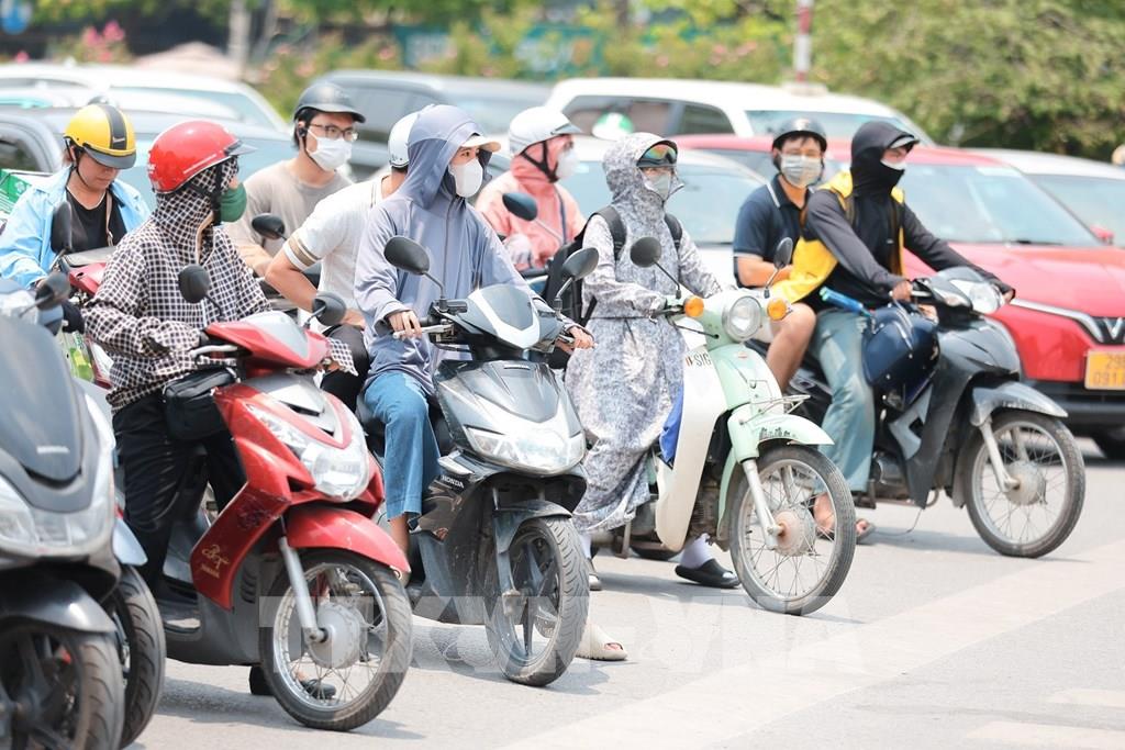 Khẩu trang, áo chống nắng là những thứ không thể thiếu của người dân khi tham gia giao thông. Ảnh: Lê Đông - TTXVN