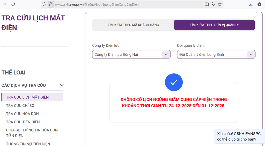Thông tin cung cấp điện (lịch tạm ngừng cấp điện mới nhất) cập nhật mới nhất tại Biên Hòa, lịch cắt điện tại Đồng Nai ngày 25/12/2025.