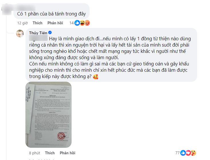 Đồng thời Thủy Tiên cho biết nếu bản thân có lấy một đồng tiền từ thiện nào để dùng riêng cho cá nhân thì sẽ bị trời hại, lấy lại hết tài sản và suốt đời phải sống nghèo khổ. Nữ ca sĩ mong muốn bản thân không làm gì sai thì dân mạng đừng gieo tiếng oán, khẩu nghiệp mãi như vậy.