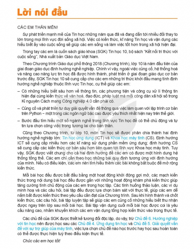 Trong tay các em học sinh là cuốn sách giáo khoa (SGK) Tin học 10, bộ sách “Kết nối tri thức với cuộc sống”. Nhà xuất bản Giáo dục Việt Nam. Theo Chương trình Giáo dục phổ thông 2018 (Chương trình), lớp 10 là năm đầu tiên của giai đoạn giáo dục định hướng nghề nghiệp. Chính vì vậy, ngoài việc củng cố, hệ thống hoá và nâng cao năng lực tin học đã được hình thành, phát triển ở giai đoạn giáo dục cơ bản trước đây, SGK Tin học 10 sẽ cung cấp cho các em những tri thức khởi đầu mang tính định hướng nghề nghiệp thuộc lĩnh vực Tin học, cụ thể giúp các em học sinh: