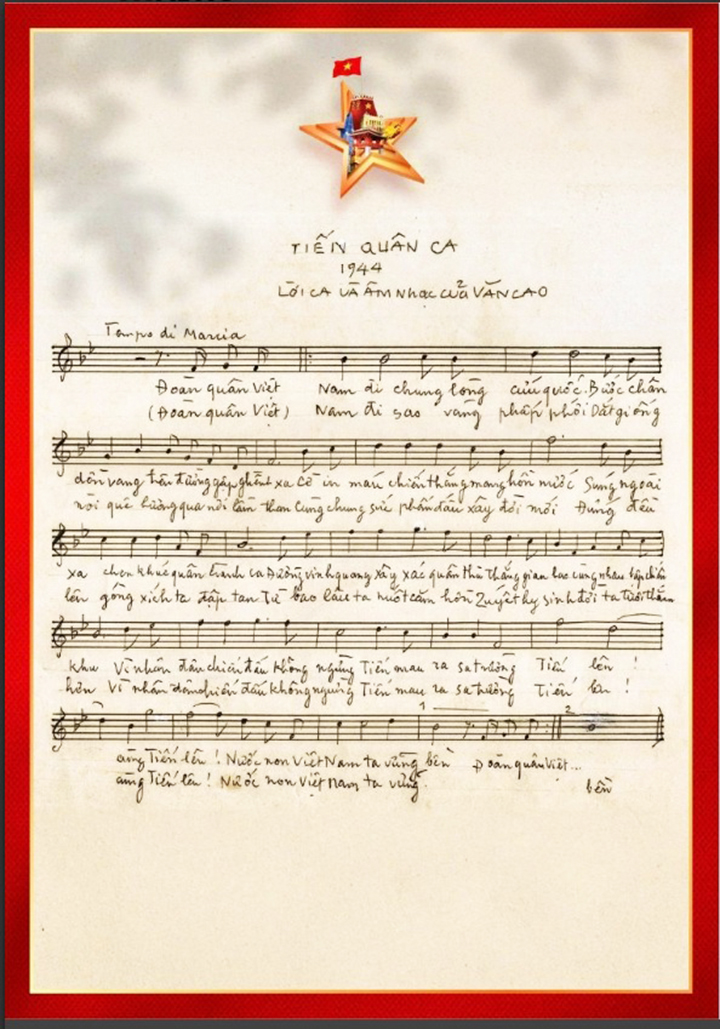 Bản chép tay ca khúc “Tiến quân ca” của nhạc sĩ Văn Cao được in trên vé mời của chương trình