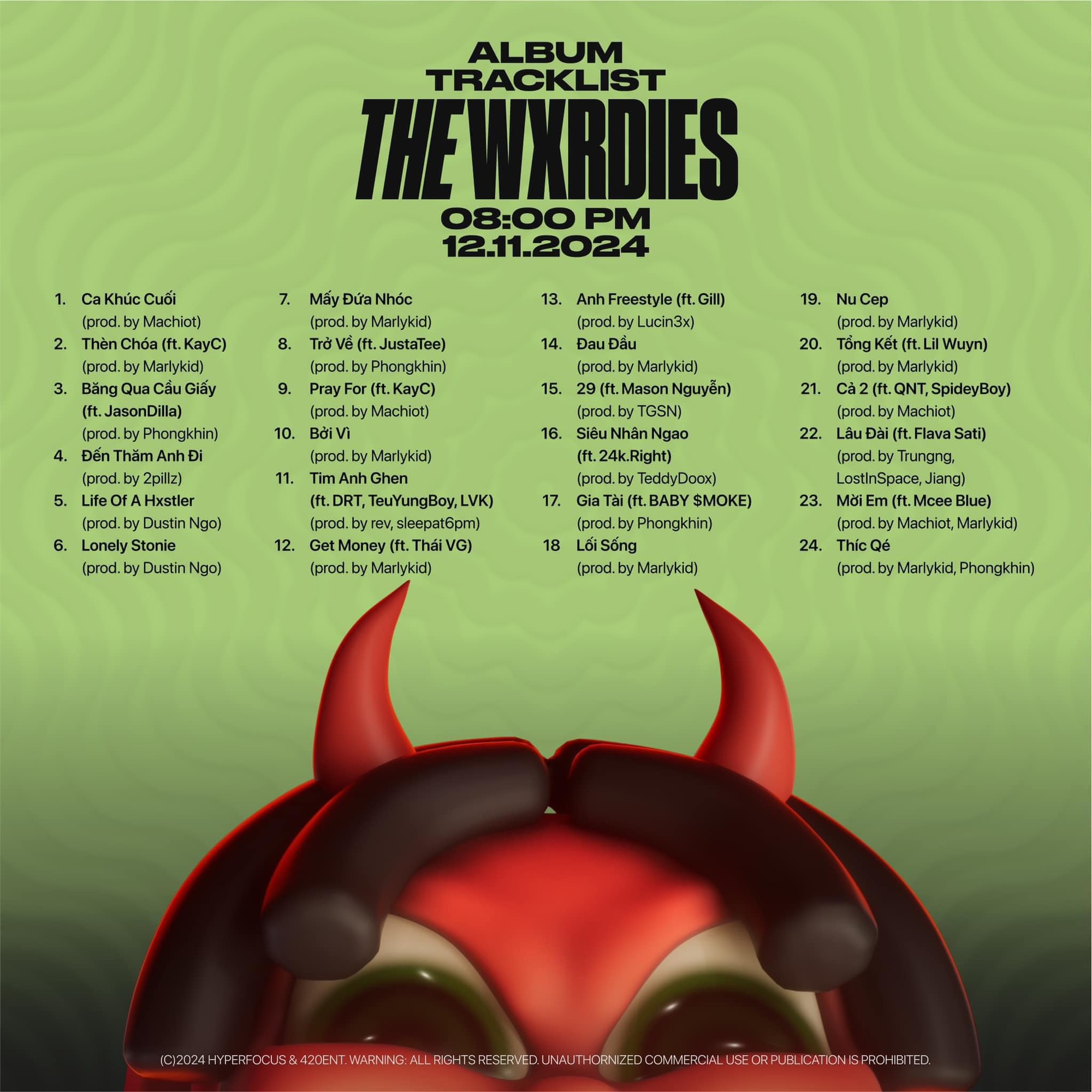 Tối 10/11, wxrdie tổ chức buổi listening party album THE WXRDIES. Đây là album đầu tay của wxrdie, dự kiến ra mắt vào ngày 12/11 tới đây với số lượng lên đến 24 tracks, hợp tác cùng 29 nghệ sĩ. Do đó, buổi tiệc nghe trước của wxrdie như một "đại hội rapper", ai nấy đều nô nức xúng xính đến dự sự kiện đặc biệt của nam rapper. Đương nhiên, không thể thiếu bạn gái tlinh.