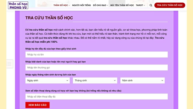Website tra cứu, xem thần số học online Phong Vũ