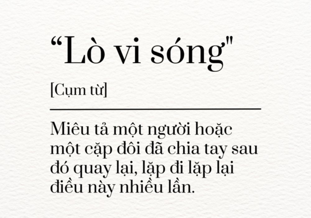Trong từ điển gen Z, "lò vi sóng" ám chỉ những cặp đôi từng chia tay nhưng sau đó quay lại với nhau, và điều này diễn ra nhiều lần. Giống như chức năng của một chiếc lò vi sóng: Bật, tắt và hâm nóng thức ăn, mối quan hệ này cũng trải qua những chu kỳ gián đoạn và nối lại liên tục.
