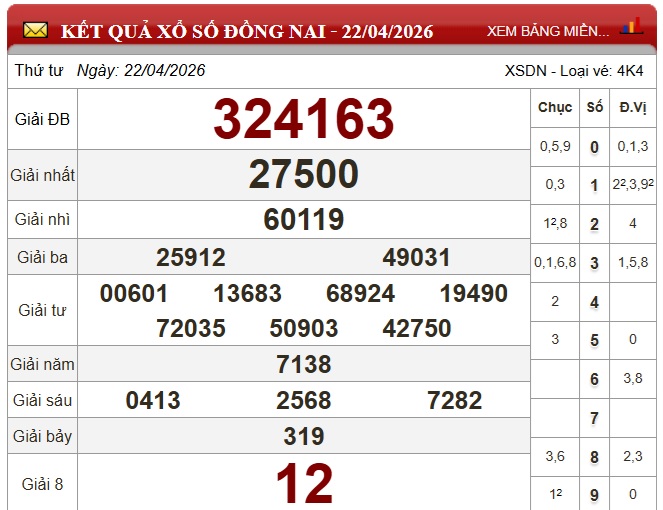 Kết quả xổ số Đồng Nai ngày 22/4/2026