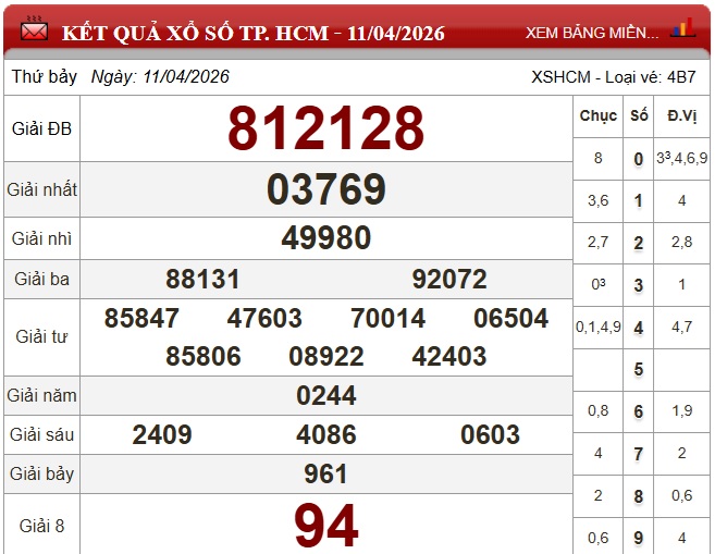 Kết quả xổ số Hồ Chí Minh ngày 11/4/2026