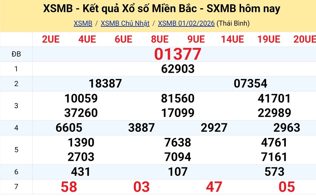 Kết quả Xổ số miền Bắc ngày 1/2/2026