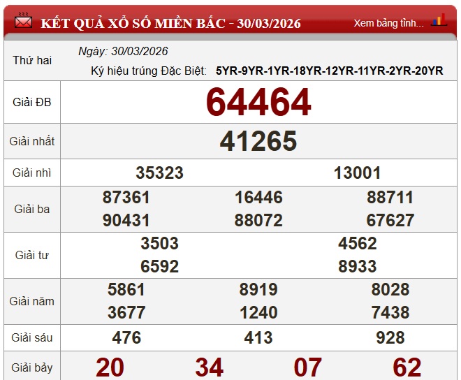 Kết quả Xổ số miền Bắc ngày 30/3/2026