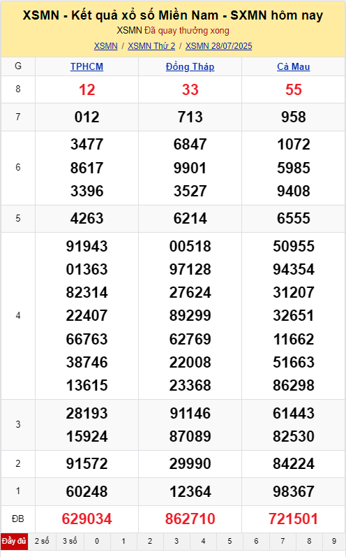 Kết quả xổ số miền Nam (XSMN) được thực hiện lúc 16 giờ 30 phút và được mở thưởng bởi Công ty xổ số kiến thiết của của Tp Hồ Chí Minh (XSHCM), Cà Mau (XSCM), Đồng Tháp (XSĐT). Kết quả của đài nào sẽ được mở thưởng tại trường quay của tỉnh đó. Xổ số hôm nay - KQXSMN ngày 28/7 được quay thưởng bắt đầu từ giải tám cho đến giải nhất, cuối cùng là công bố kết quả giải đặc biệt.