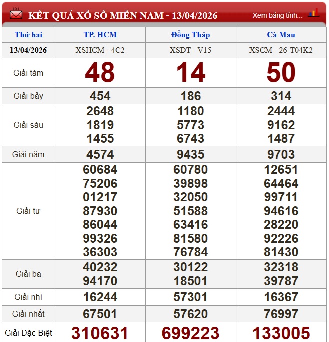 Kết quả xổ số miền Nam ngày 13/4/2026