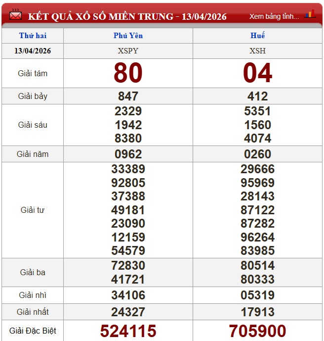 Kết quả xổ số miền Trung ngày 13/4/2026