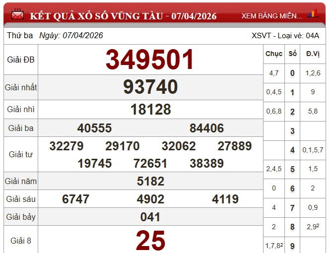 Kết quả xổ số Vũng Tàu Thứ Ba ngày 7/4/2026