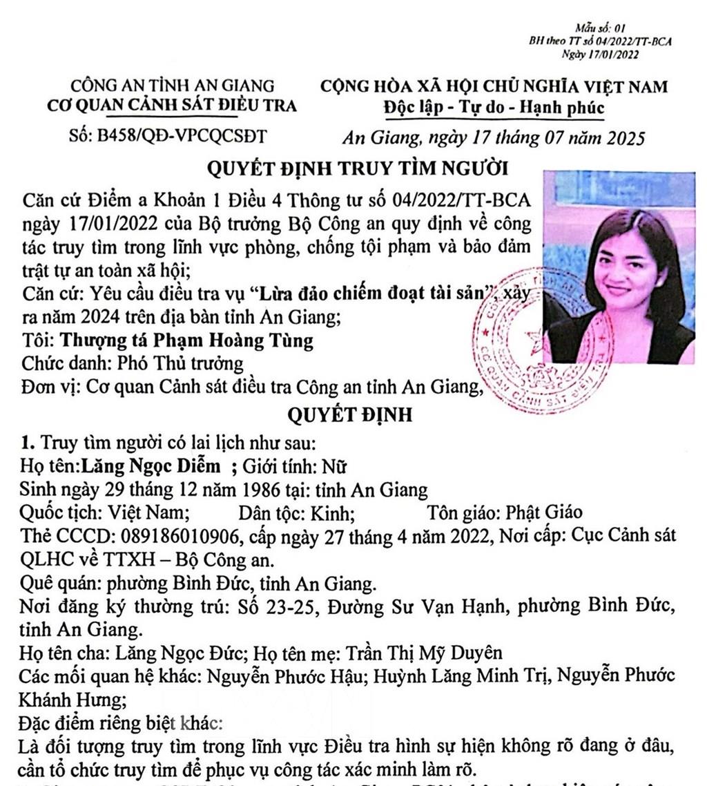 Cơ quan CSĐT tỉnh An Giang vừa ra Quyết định truy tìm đối với Lăng Ngọc Diễm để phục vụ yêu cầu điều tra vụ án "Lừa đảo chiếm đoạt tài sản".