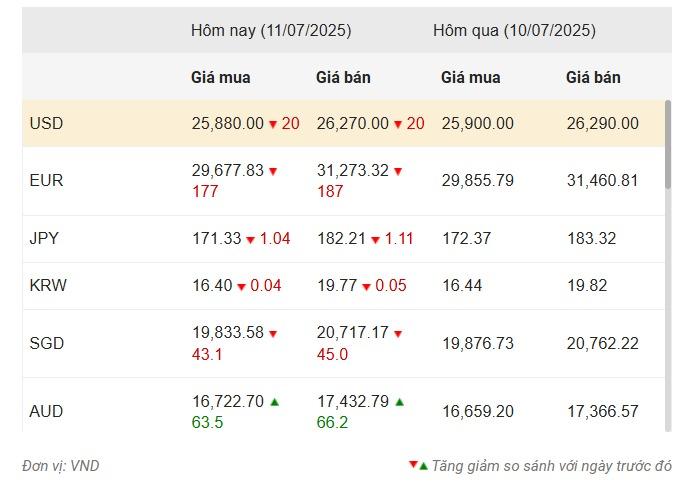 Nhìn chung, trong phiên giao dịch ngày 11/07/2025, phần lớn các đồng ngoại tệ đều giảm giá so với VND, ngoại trừ đồng AUD. Điều này phản ánh diễn biến tích cực của các đồng tiền mạnh trên thị trường quốc tế trong bối cảnh biến động kinh tế toàn cầu vẫn tiếp diễn.