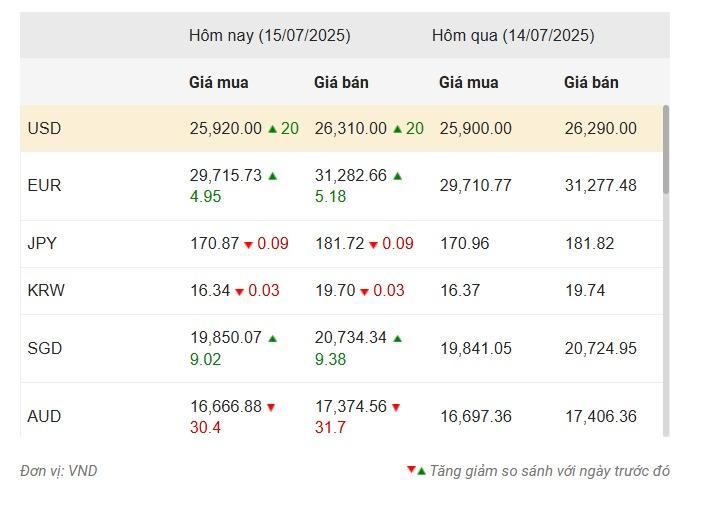 Nhìn chung, trong phiên giao dịch ngày 15/07/2025, phần lớn các đồng ngoại tệ đều giảm giá so với VND, ngoại trừ đồng USD, EUR. Điều này phản ánh diễn biến tích cực của các đồng tiền mạnh trên thị trường quốc tế trong bối cảnh biến động kinh tế toàn cầu vẫn tiếp diễn.