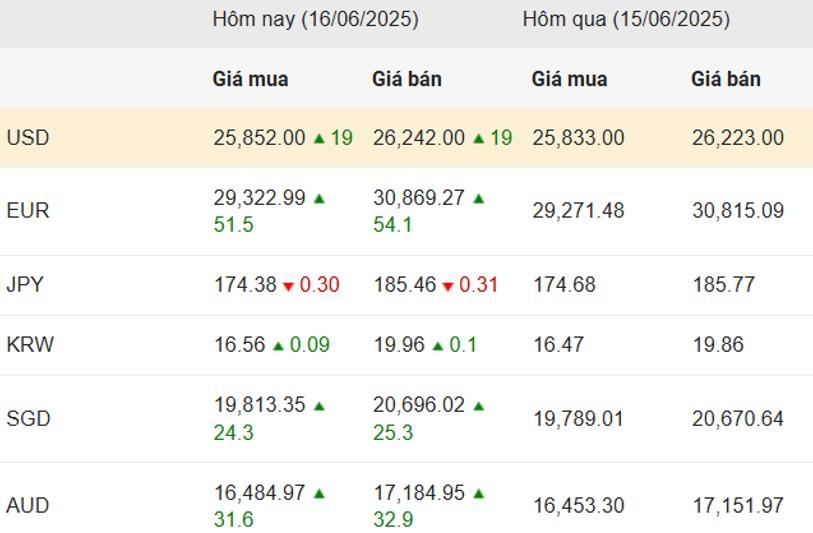 Nhìn chung, trong phiên giao dịch ngày 16/06/2025, phần lớn các đồng ngoại tệ đều giảm giá so với VND, ngoại trừ đồng JPY. Điều này phản ánh diễn biến tích cực của các đồng tiền mạnh trên thị trường quốc tế trong bối cảnh biến động kinh tế toàn cầu vẫn tiếp diễn.