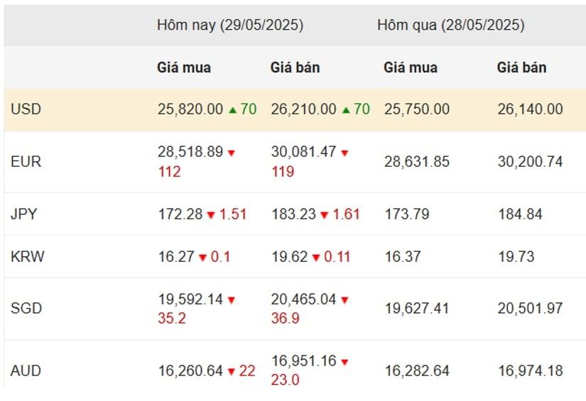 Nhìn chung, trong phiên giao dịch ngày 29/05/2025, phần lớn các đồng ngoại tệ đều giảm giá so với VND, ngoại trừ đồng USD. Điều này phản ánh diễn biến tích cực của các đồng tiền mạnh trên thị trường quốc tế trong bối cảnh biến động kinh tế toàn cầu vẫn tiếp diễn.