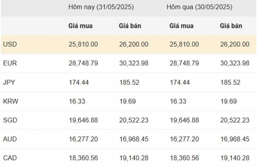Tỷ giá USD hôm nay 31/5/2025 như sau: tính tới lúc 10:00 ghi nhận sự chững lại, tỷ giá các ngoại tệ chủ chốt khác cũng không biến động so với ngày hôm trước.