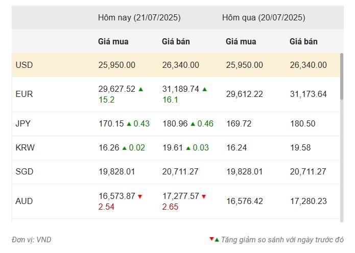 Đồng USD Không có sự điều chỉnh về giá so với cuối phiên giao dịch ngày 20/07, lần lượt là 25.950 VND và 26.340 VND. Trong khi đó, đồng EUR ghi nhận mức tăng nhẹ trong ngày. Cụ thể, tỷ giá mua vào tăng 15.2 đồng lên 29.627.52 VND, và tỷ giá bán ra tăng 16.1 đồng, lên mức 31.189.74 VND.