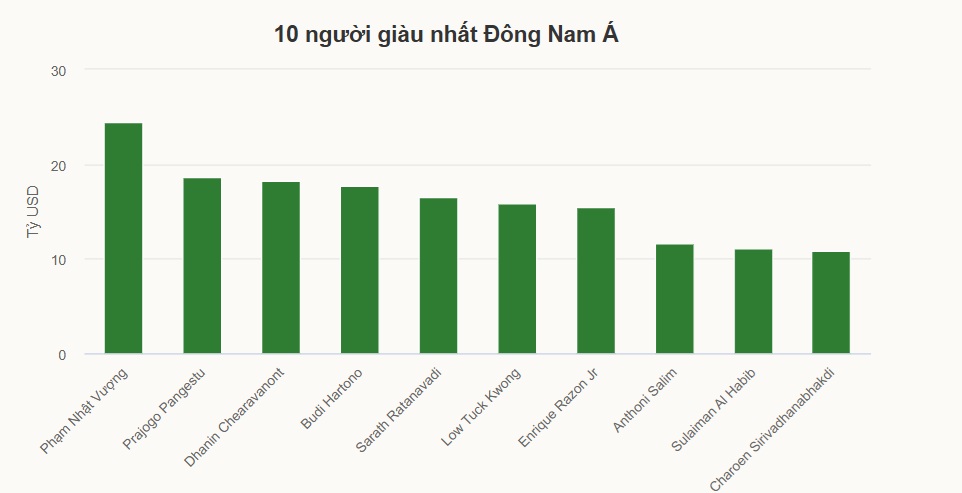 Theo bảng xếp hạng tỷ phú theo thời gian thực của Forbes, tính đến ngày 5/4, ông Phạm Nhật Vượng sở hữu khối tài sản 24,5 tỷ USD, xếp thứ 100 trên thế giới về độ giàu có. Như vậy, tỷ phú này đã vượt ông Prajogo Pangestu, người Indonesia, nhà sáng lập tập đoàn Barito Pacific, để trở thành người giàu nhất Đông Nam Á.