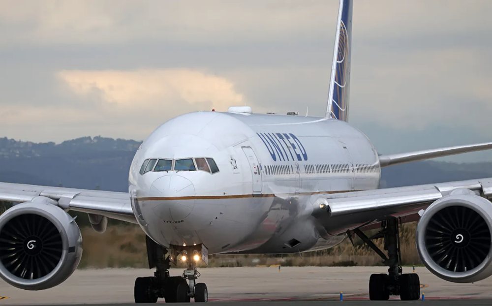 Một chiếc Boeing 777-224(ER) của hãng United Airlines đang chuẩn bị cất cánh trên đường băng sân bay Barcelona, Tây Ban Nha, vào ngày 12 tháng 3 năm 2025. (Joan Valls/Urbanandsport/NurPhoto qua Getty Images)