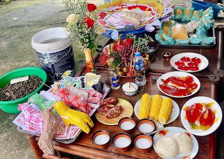 Mâm lễ cúng chúng sinh ngoài trời. (Ảnh: Hương Giang)