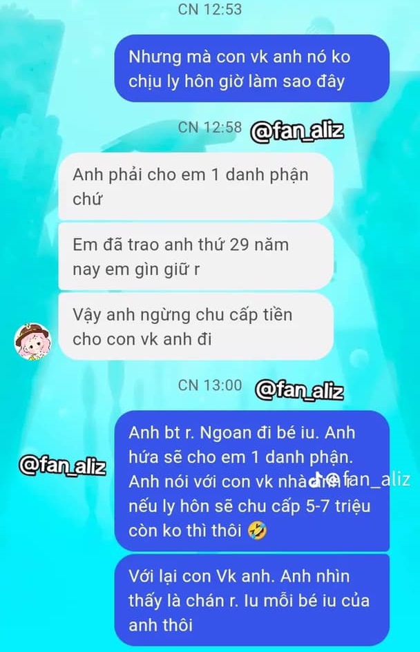 Trong các đoạn tin nhắn được lan truyền cho là của Hạt Tiêu Play và Mr.Vịt, nữ TikToker cũng biết anh chàng có vợ con nhưng vẫn muốn tiếp tục mối quan hệ.