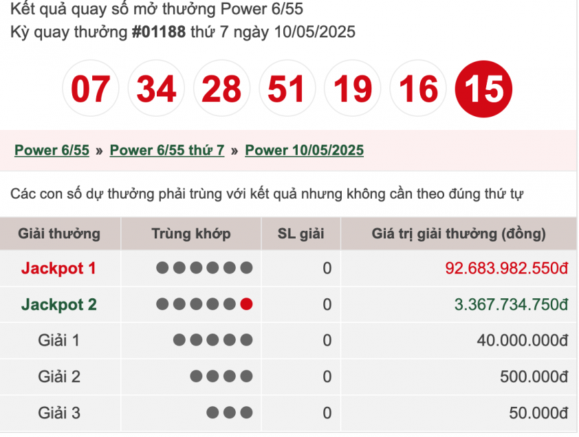 Kết quả Vietlott Power 6/55 ngày 10/5/2025: