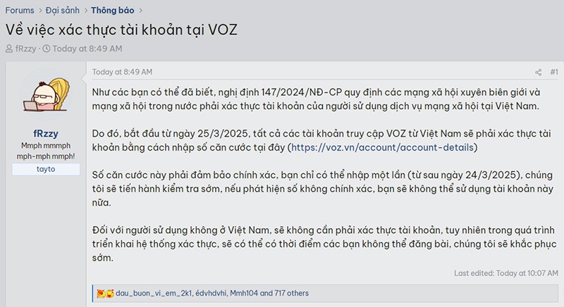 Cụ thể, thông báo yêu cầu các thành viên phải nhập số Căn cước công dân (CCCD) để được phép đăng bài hay tham gia thảo luận tại diễn đàn. Động thái này cho thấy nỗ lực đáng khen của VOZ hướng đến việc thực hiện Nghị định số 147/2024/NĐ-CP do Chính phủ ban hành.