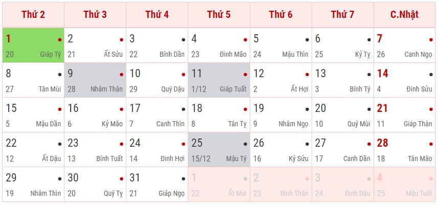 Lịch âm, Lịch vạn niên tháng 12 năm 2024