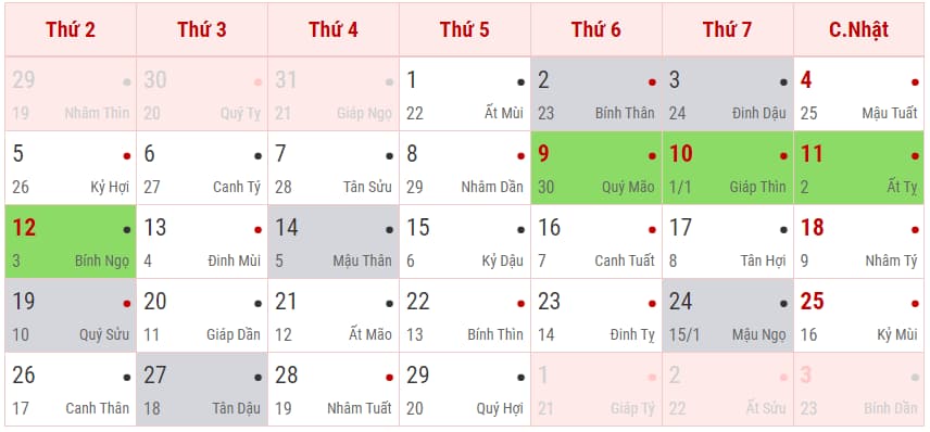 Lịch âm, Lịch vạn niên tháng 4 năm 2024