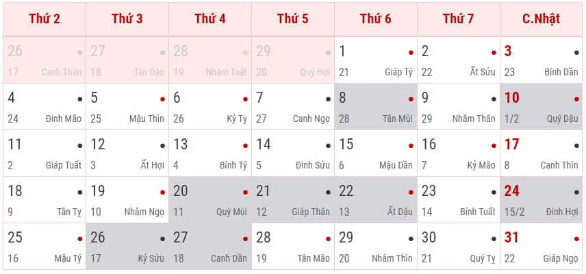 Lịch âm, Lịch vạn niên tháng 2 năm 2024