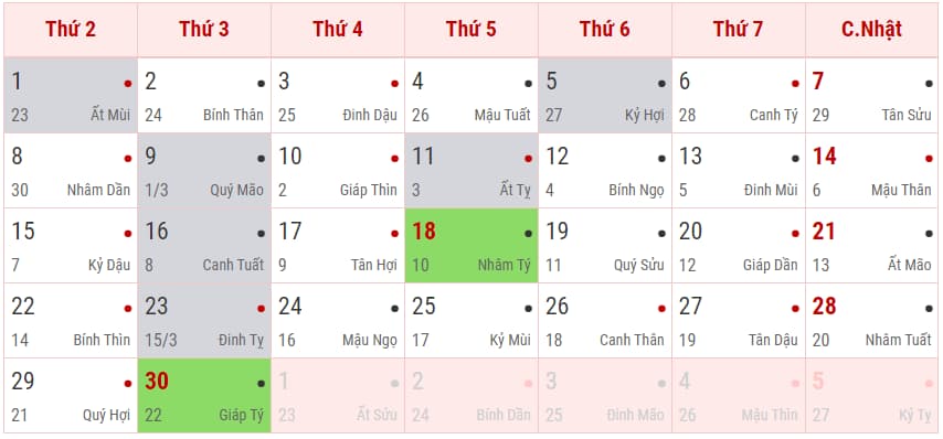 Mặt khác, lịch âm 2024 được xác định theo chu kỳ 12 con giáp. Năm 2024 là năm thứ 5 trong chu kỳ 12 con giáp bắt đầu từ ngày 10/02/2024 Dương lịch.