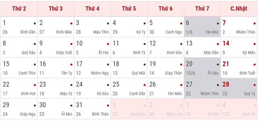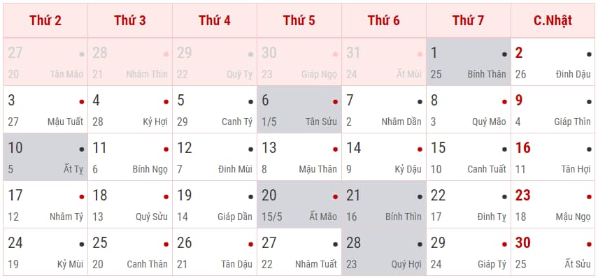 Lịch âm, Lịch vạn niên tháng 5 năm 2024