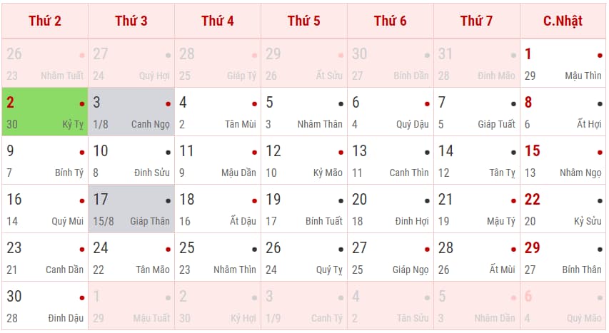 Lịch âm, Lịch vạn niên tháng 8 năm 2024