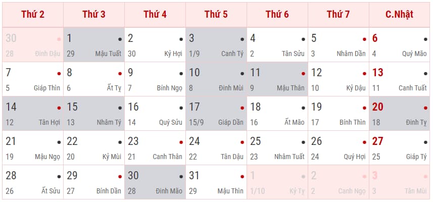 Lịch âm, Lịch vạn niên tháng 9 năm 2024