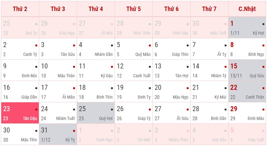 Lịch âm, Lịch vạn niên tháng 11 năm 2024