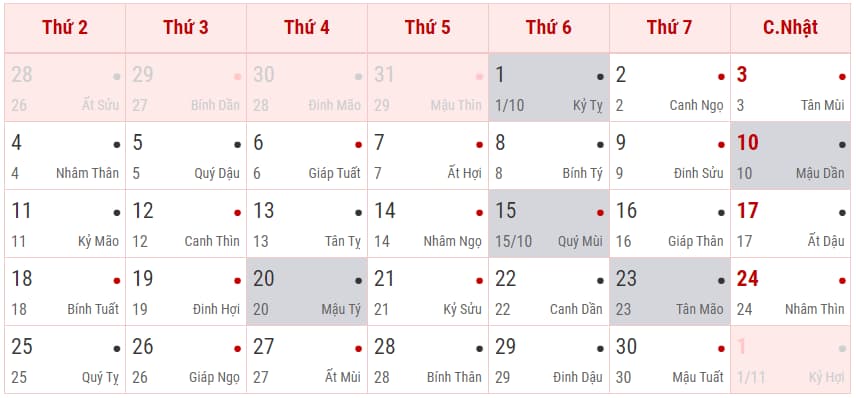 Lịch âm, Lịch vạn niên tháng 10 năm 2024
