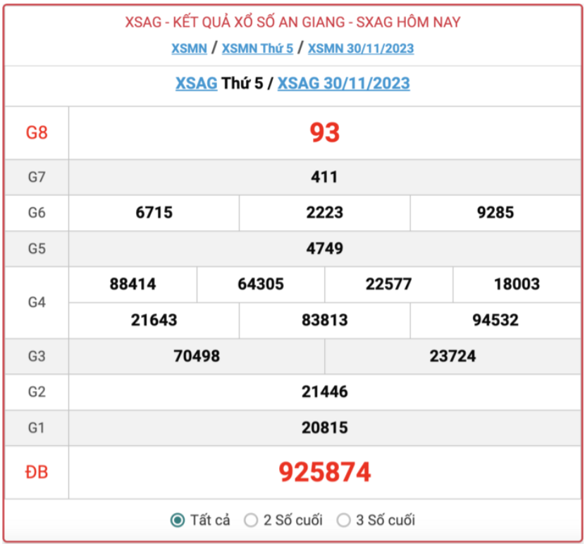 - Kết quả XSAG ngày 23/11/2023