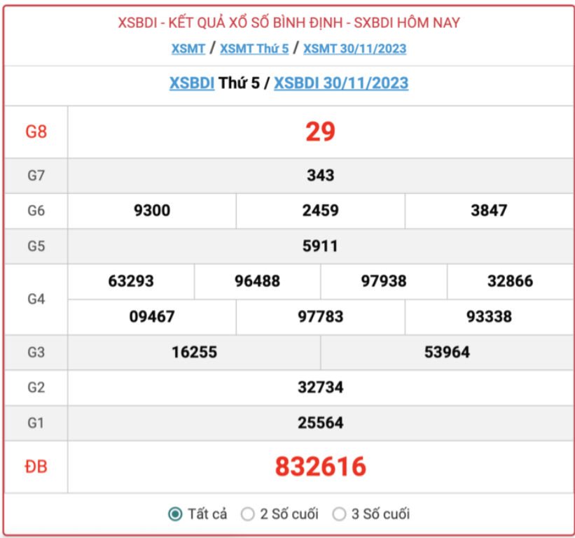 - Kết quả XSBDI ngày 23/11/2023