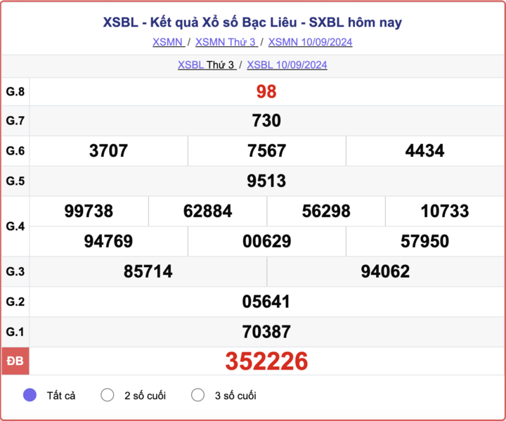 XSBL 17/9 - kết quả xổ số Bạc Liêu hôm nay. Trực tiếp KQXS Bạc Liêu hôm nay thứ 3 ngày 17/9/2024 - xổ số Bạc Liêu thứ 3 - XSBL thứ 3 ngày 17/9/2024. Kết quả XSBL hôm nay 17/9/2024.