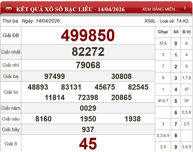 Theo dõi kết quả xổ số Bạc Liêu hôm nay 14/4/2026 nhanh chóng, chính xác nhất để không bỏ lỡ thời gian nhận thưởng.