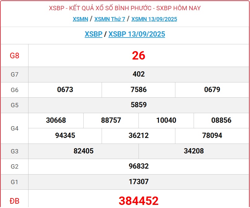 Kết quả xổ số Bình Phước hôm nay ngày 27/9/2025 sẽ được cập nhật nhanh chóng và chính xác nhất. Kết quả các giải thưởng XSBP 27/9/2025 được công bố lần lượt từ giải nhất cho đến giải tám, cuối cùng là giải đặc biệt.